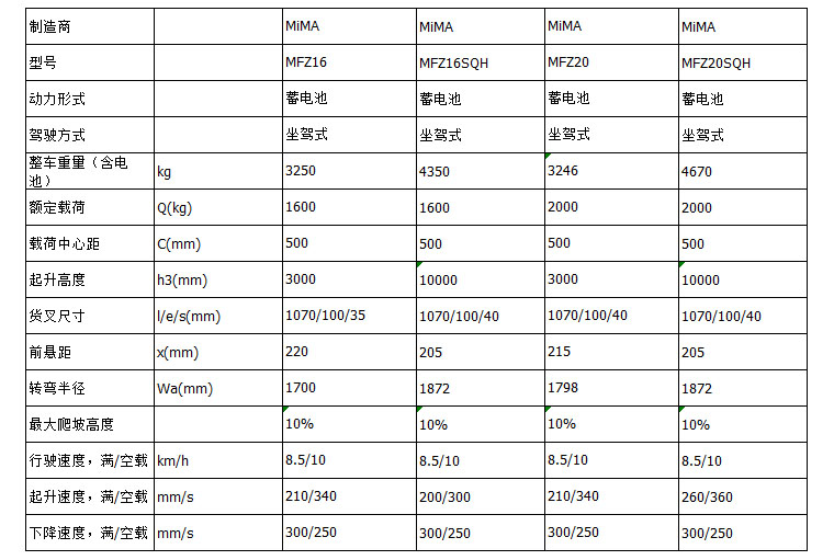 MIMA電動(dòng)叉車(chē)MFZ16系列是新款前移式叉車(chē),承載能力1.6-2.0噸,門(mén)架可以整體前移或縮回,擁有較小的車(chē)身及轉(zhuǎn)彎半徑和更高的效率。